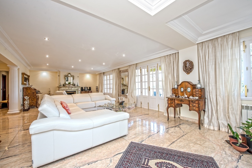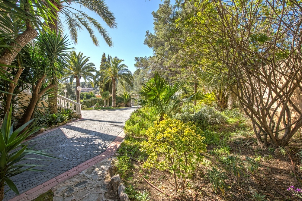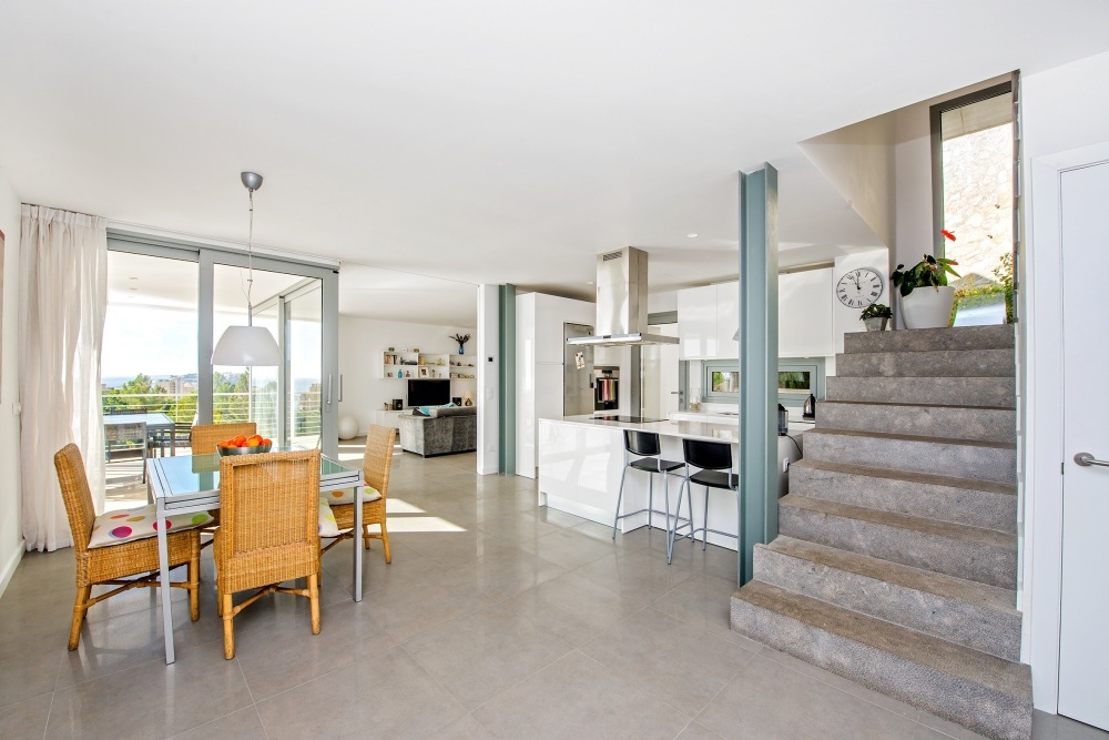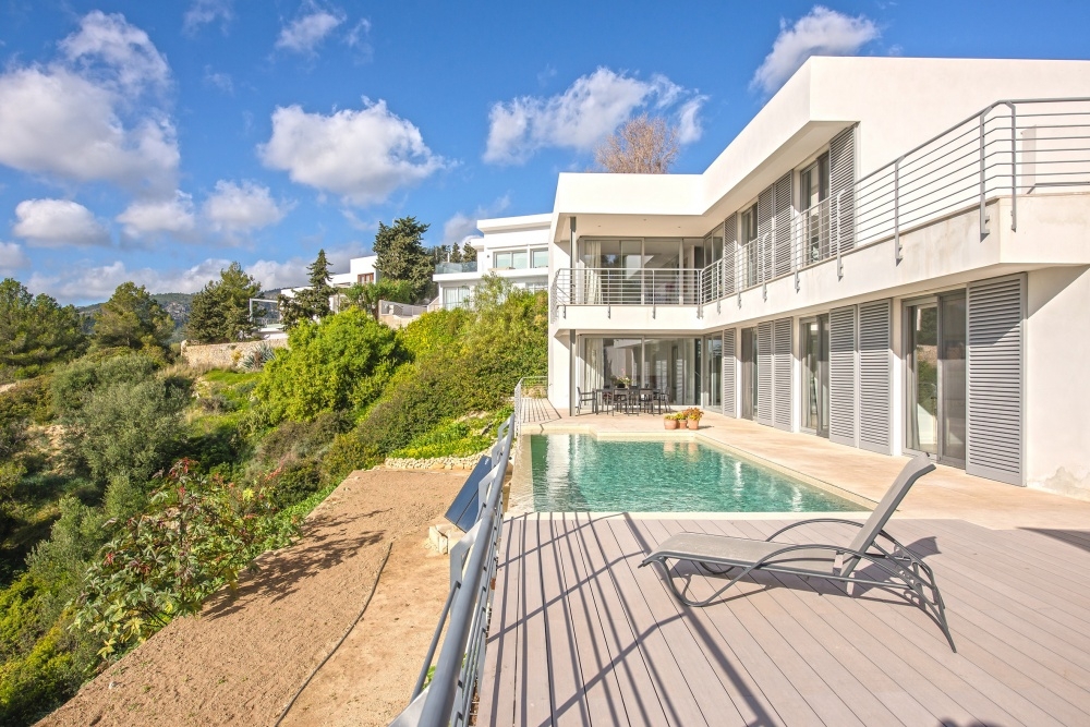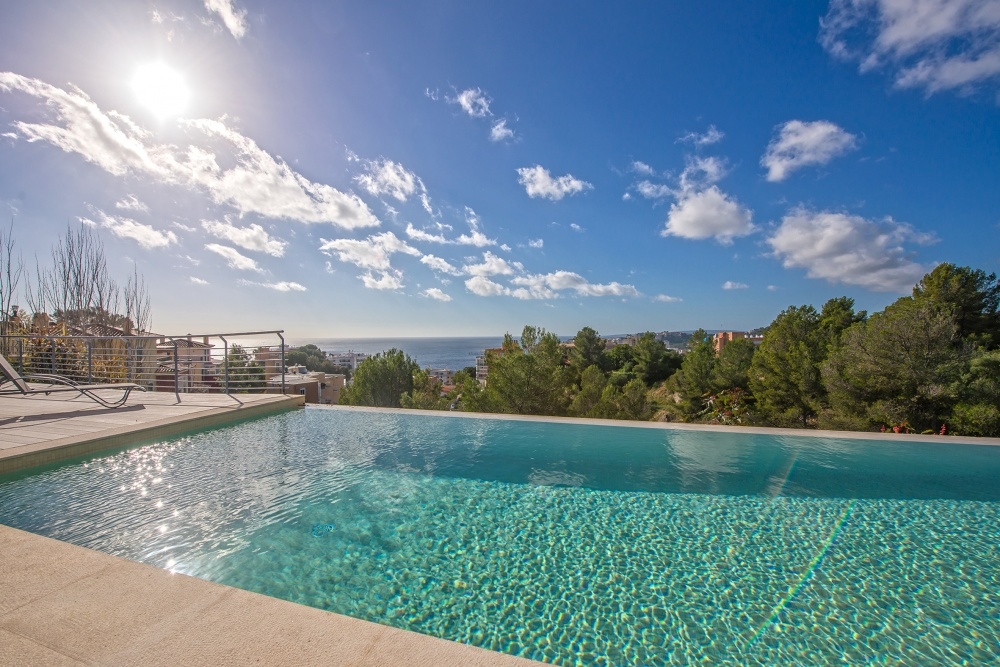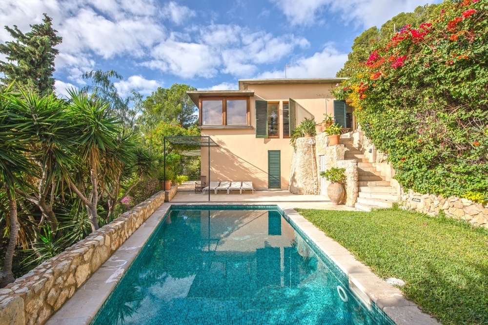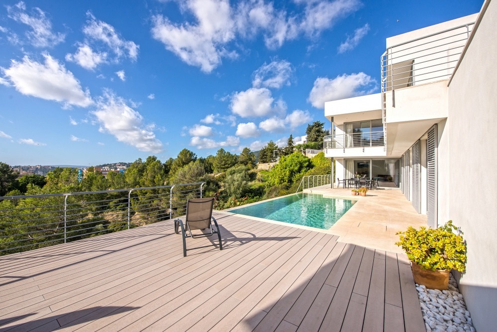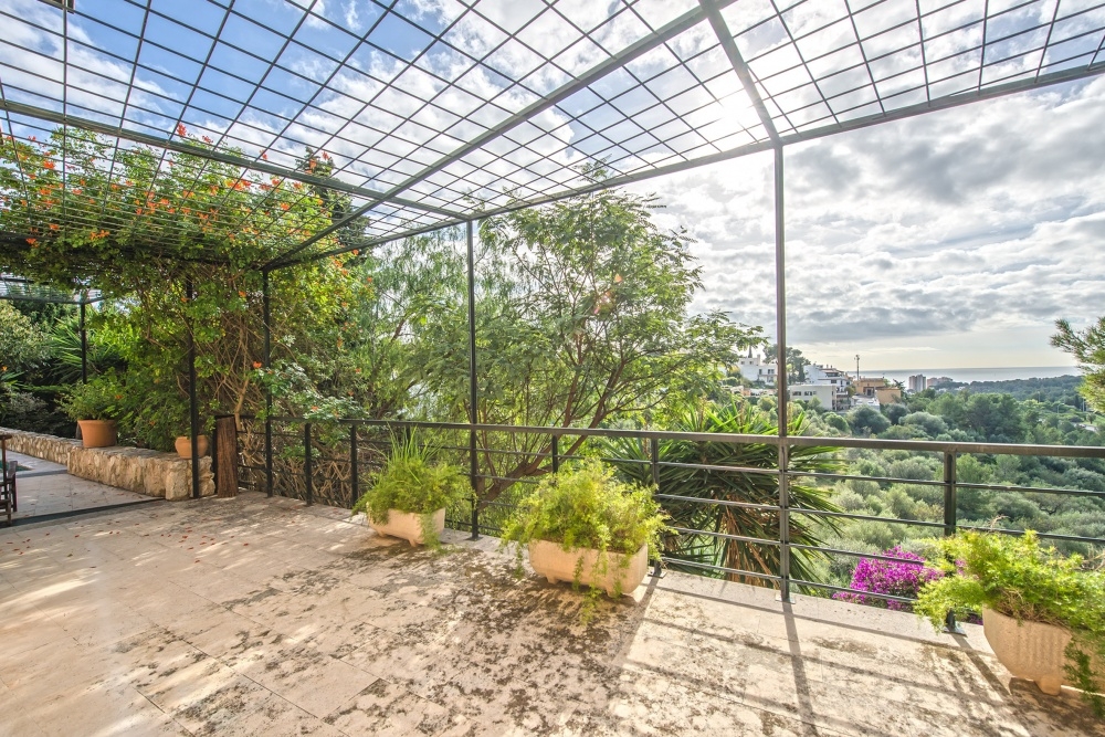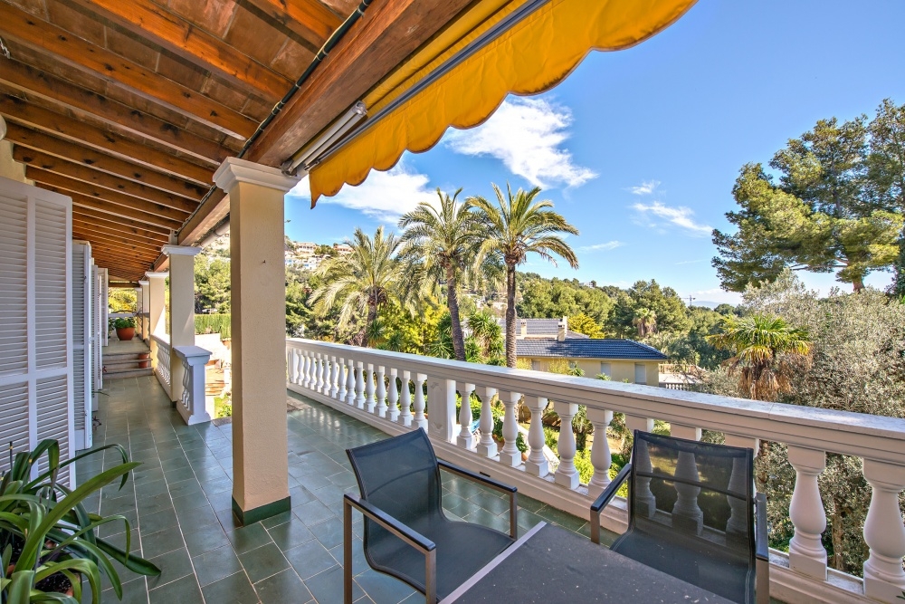 Villa mit offenem Blick und Pool in Son Vida, Palma de Mallorca. Vom Wohnbereich, der Balkonterrasse und der Master-Suite hat man eine schöne Aussicht auf Palma. Das Haus bietet sehr gute Privatsphäre.