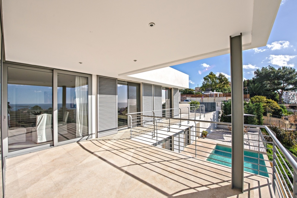 Zu verkaufen moderne Meerblick-Villa mit vielen Terrassen und Pool im exklusiven Bonanova-Viertel, Palma de MallorcaSie hat Südwest-Orientierung und bietet offenen, unverbaubaren Meerblick von den Wohnbereichen, den meisten Schlafzimmern, den Terrassen und dem Infinity-Pool (8 x 4,5 m). Die Wohnbereiche und alle Schlafzimmer haben Zugang zu sonnigen Terrassen...