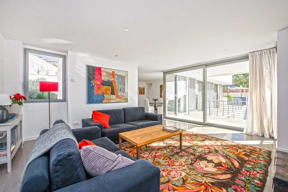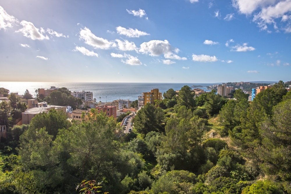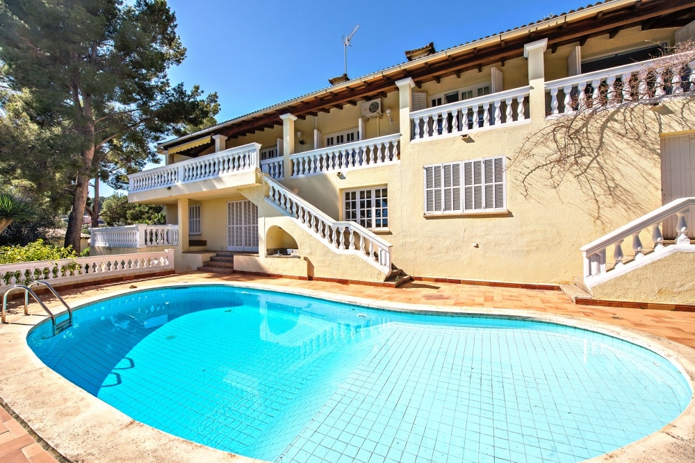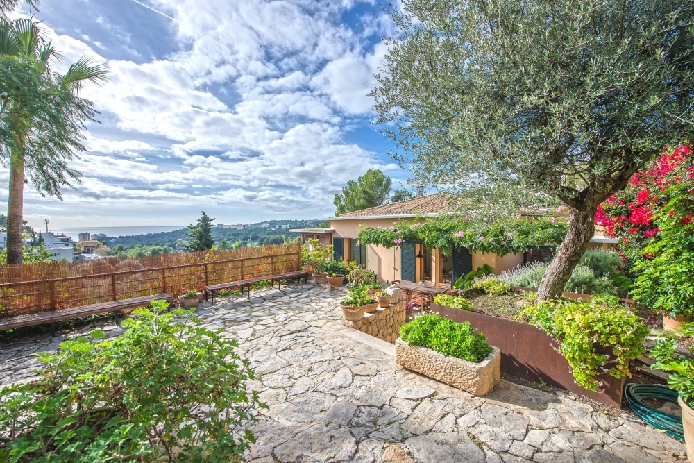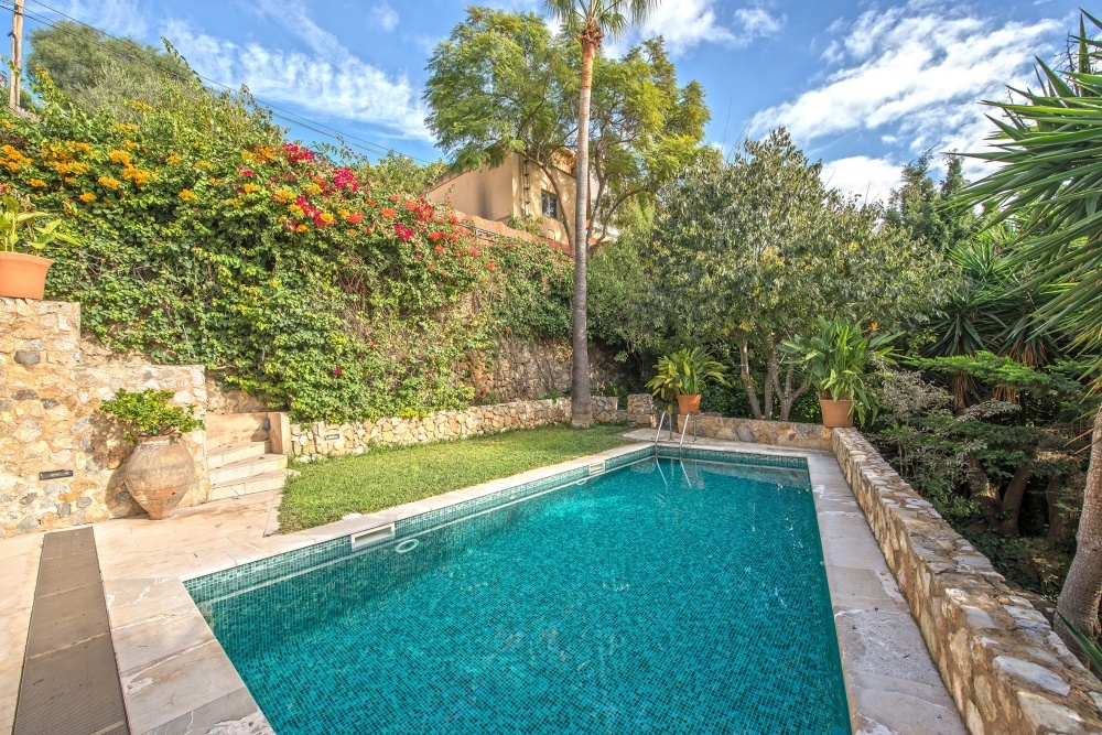 Helle Villa mit Pool und Meeresblick in Südorientierung in Genova , Palma de Mallorca . Diese Villa mit sonnigen Terassen, Pool und Meeresblick handelt sich um ein helles Haus mit grossen Fenstern. Es wurde in den 90ern komplett renoviert und ist in einem ordentlichen Zustand.
