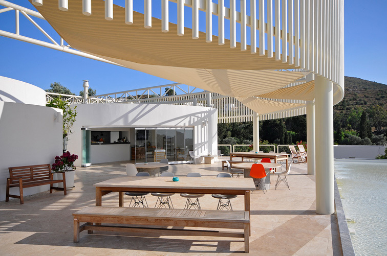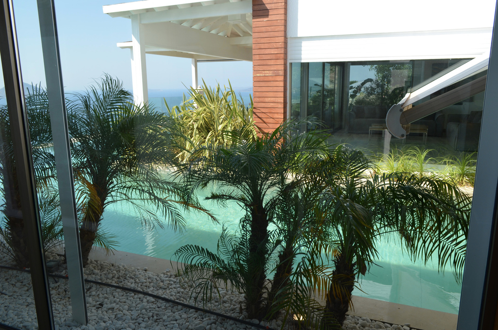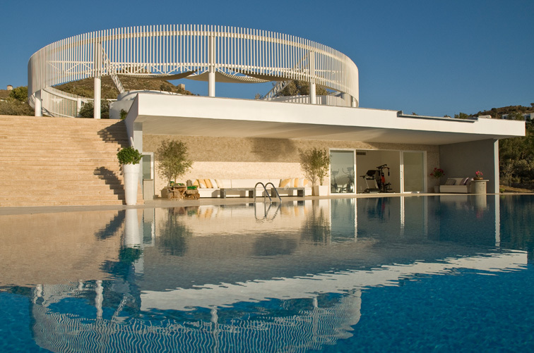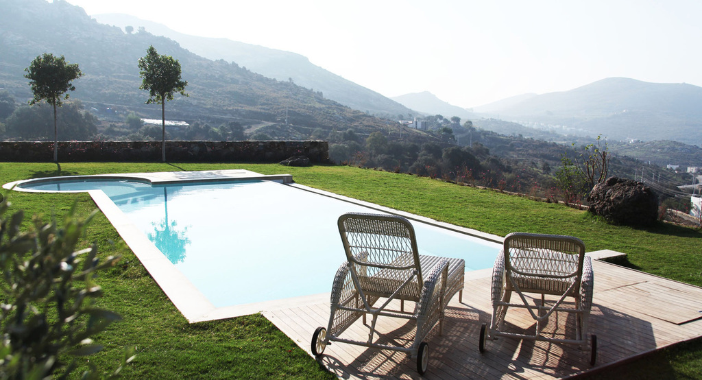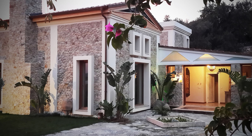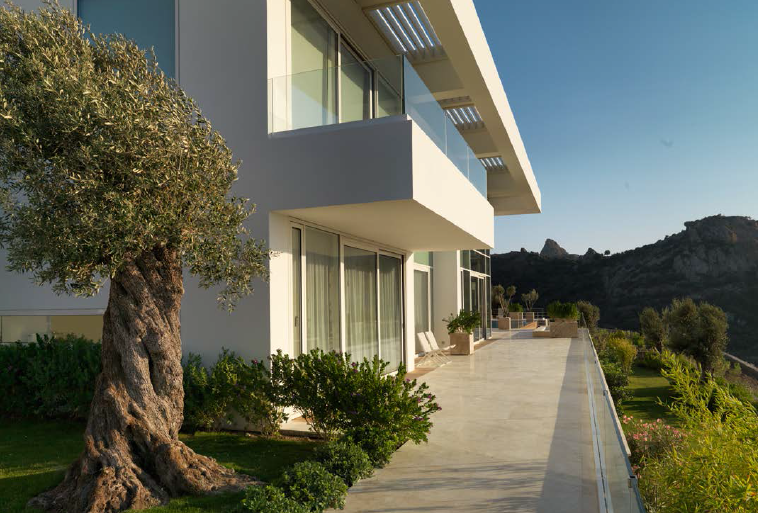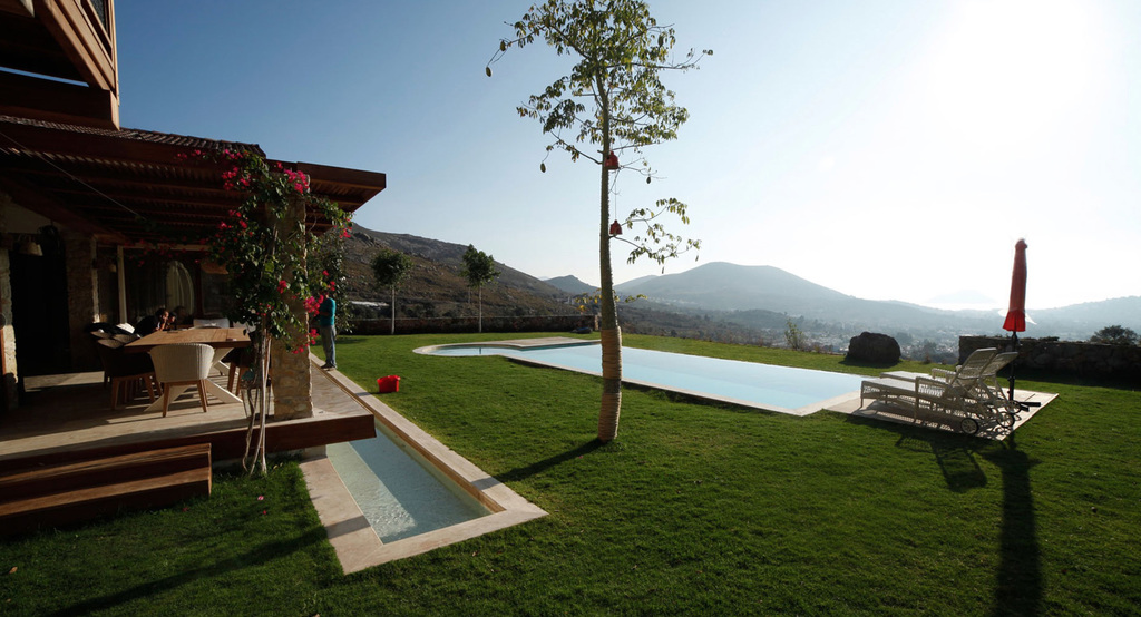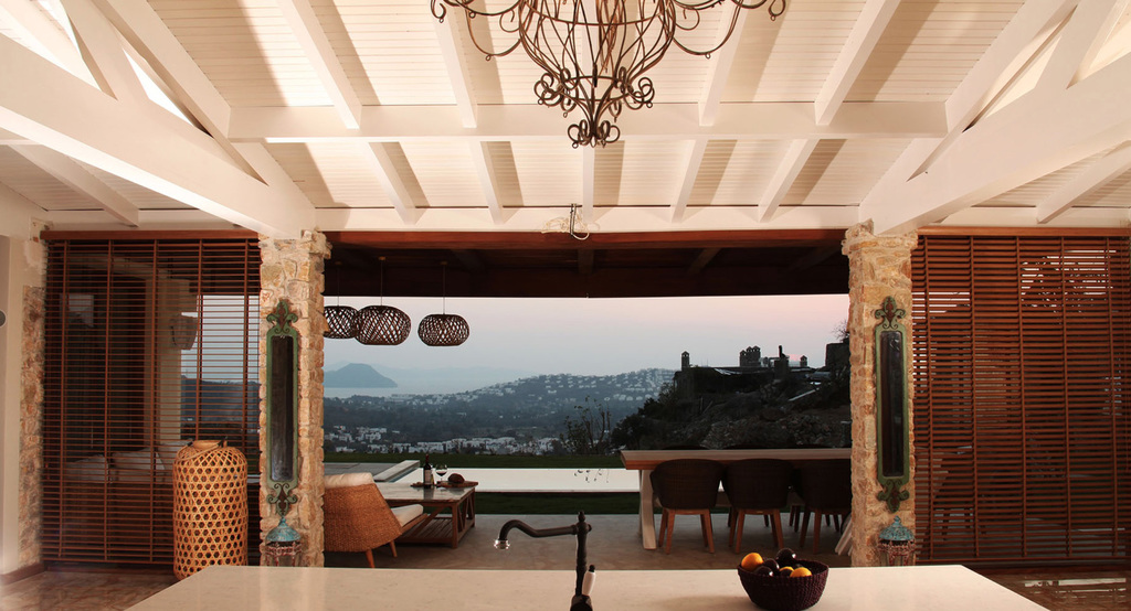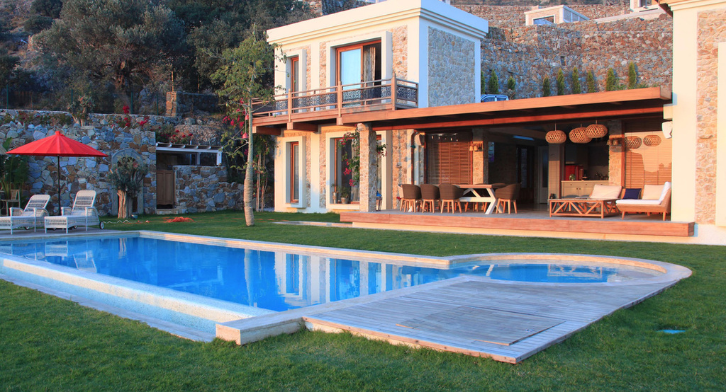 Diese Villa ist ein eine inszenierung von geometrischen Formen, Licht und Schatten und hat streng geometrischen Iicht durchflutete Flâchen und sind unverwechselbar und einzigartig.Jedes Haus ist grossflâchig und von natürlich gewachsener Landschaft mit 5000m2 umgeben.Die Aussenrâume wirken wie kubischen Umrissen herausgeschnitten und betonen die skulpurale Wirkung des Baues.Die elegante Einfahrt erlaubt einen überweltigindenAusblick aufs Meer und in die Berge von Bodrum.Wohnraum mit monumentalen Kamin ,überdachte Terasse und freischwebende Treppe zu den 3 Schlafzimmern mir Bâdern sind natürlich obligatorisch.Durch die Pool terasse hat man die poetische Aussicht auf die Berglandschaft und Agâisches Meer.